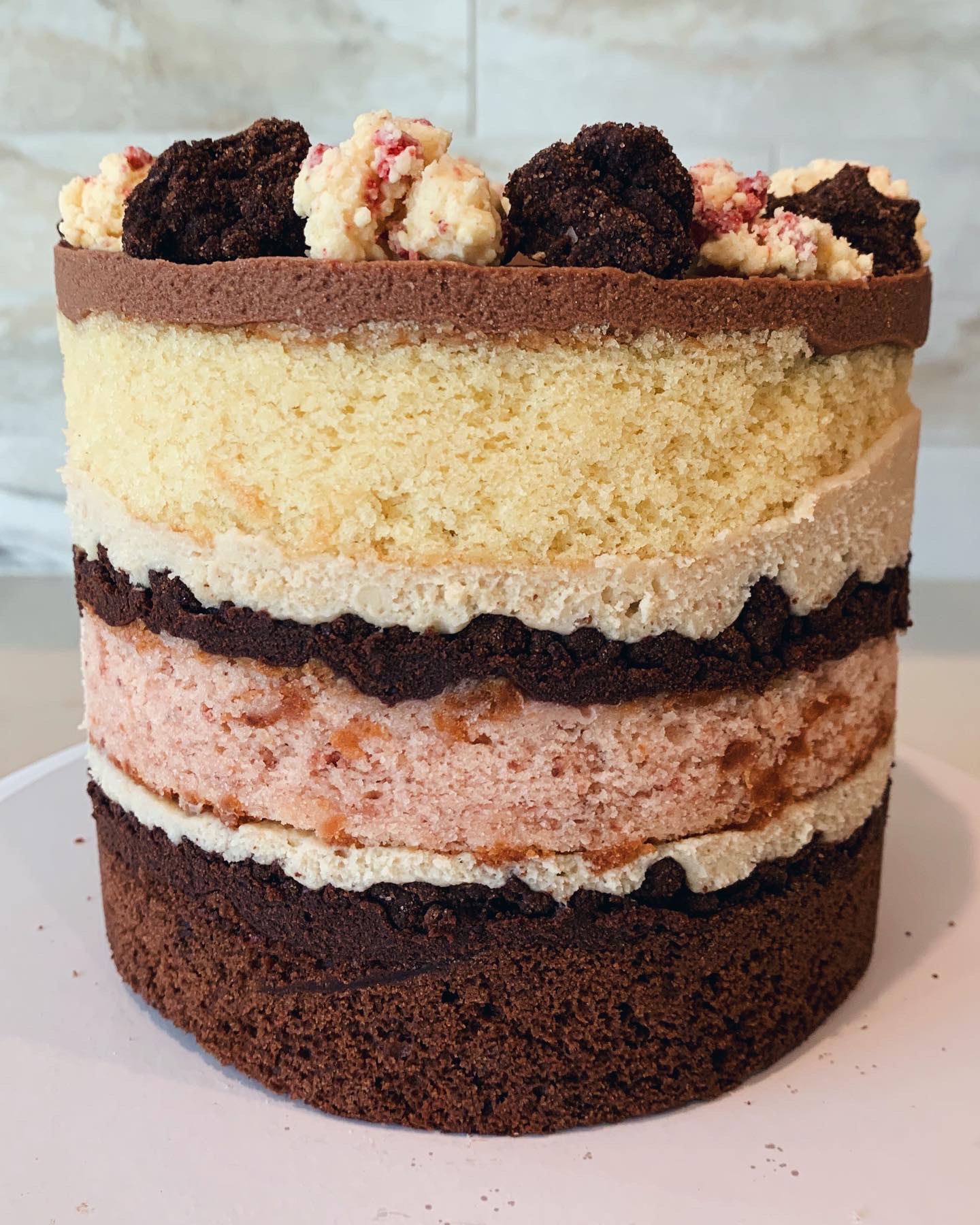 Neopolitan Cake - Chocolate cake, strawberry cake and vanilla cake, fudge sauce, strawberry frosting, chocolate frosting, chocolate crunch and strawberry vanilla crunch ($100/$120)